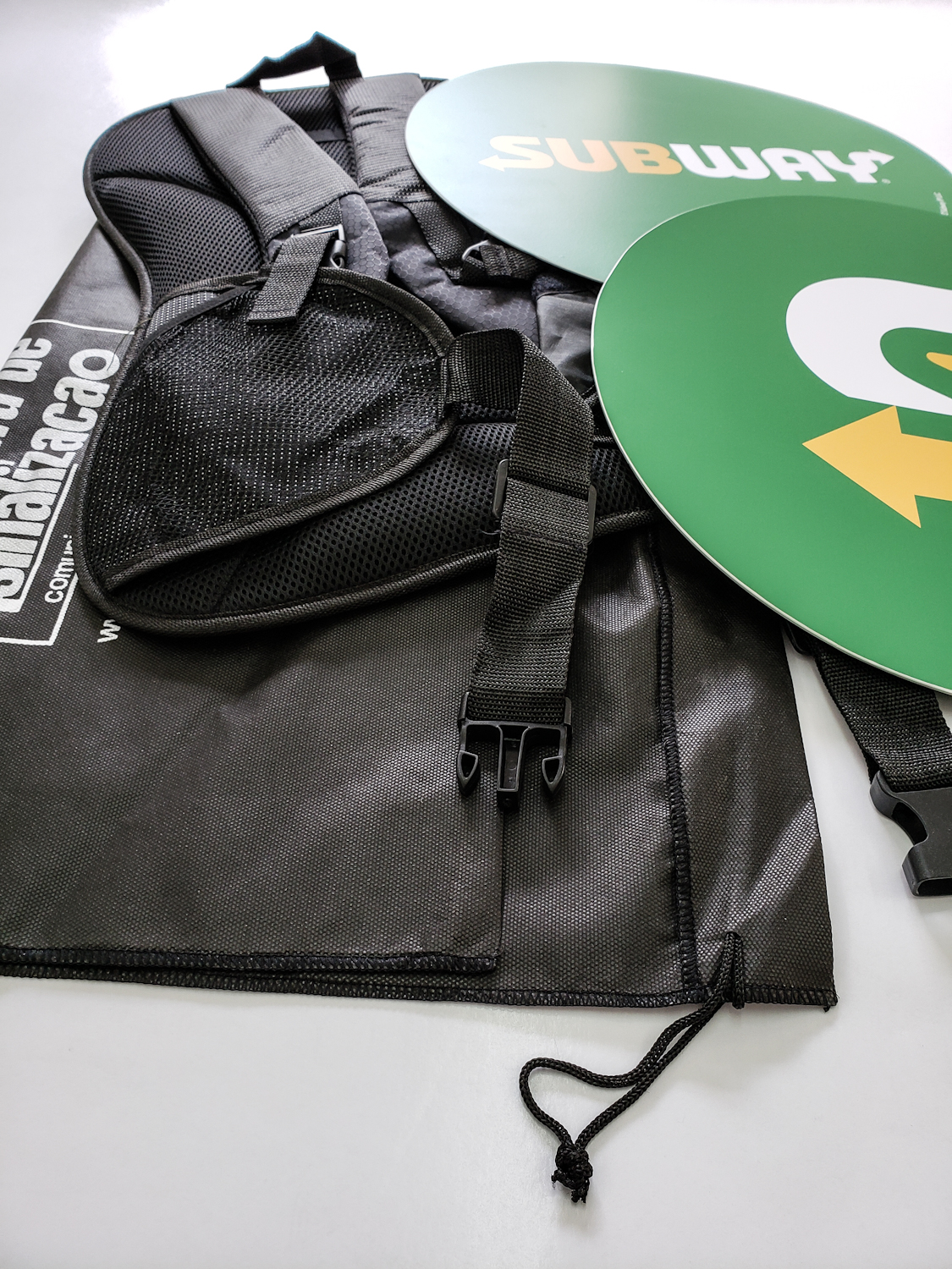A Mochila Pirulito acompanha: Mochila super – resistente com porta objetos, haste em alumínio, disco em PVC impresso com a sua Comunicação, e case para transporte.
