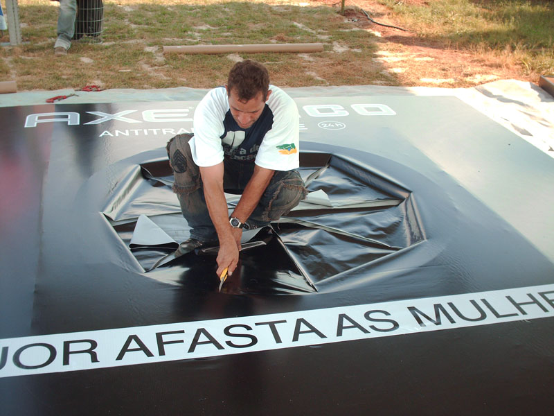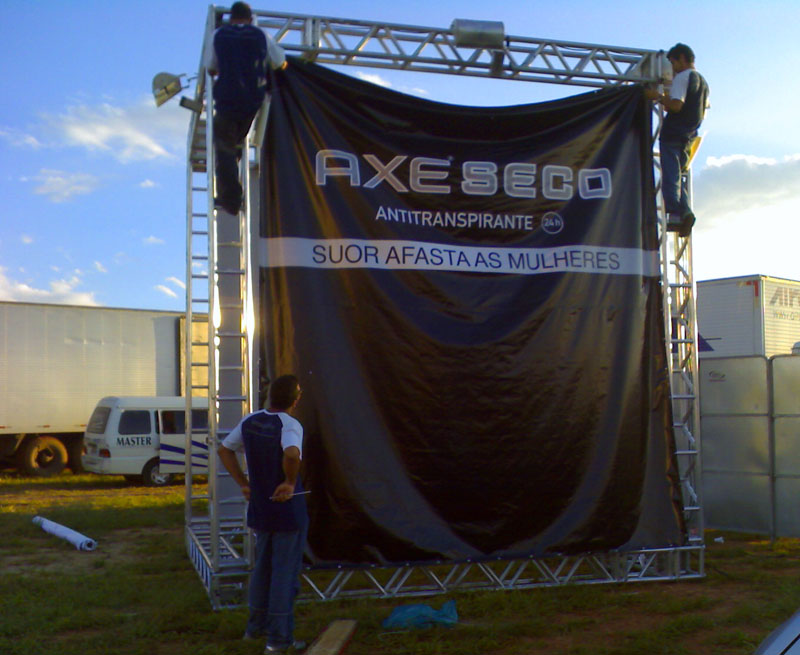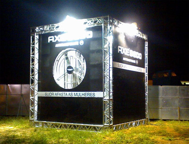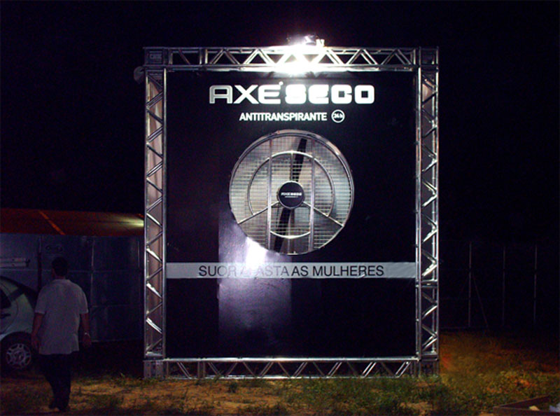 Para divulgar o lançamento do Axe Seco e refrescar a galera que estava no local do evento, a agência de AXE, BorghiErh/Lowe criou dois megas tufões em formato de cubo com motores tri- fásicos 220 Vac com 15 cavalos de potência. A Oficina de Sinalização foi responsável pela criação e produção de todo projeto cenográfico.